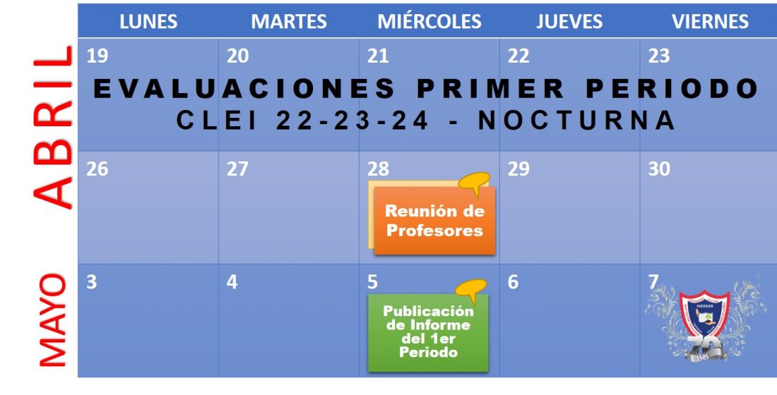 Apreciados Estudiantes de los CLEI 22, 23 y 24 – Jornada Nocturna: Les agradecemos tener en cuenta las siguientes fechas para finalizar el Primer Período Académico. Les deseamos a todos, salud y bienestar. Evaluaciones finales: desde el lunes 19 hasta […]